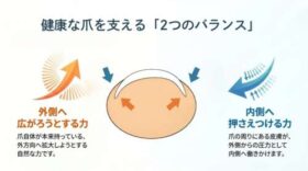 本来、爪には「外側へ広がろうとする力」があります。それに対して、周りの皮膚からは「内側へ押さえつける力」がかかっています。この2つの力がバランスよく釣り合っているのが、健康な爪の状態です。